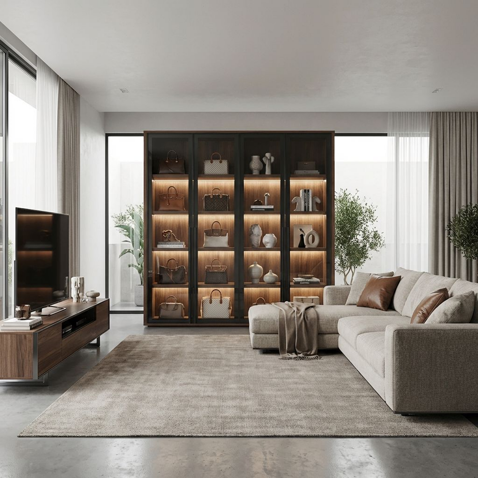 Create a gallery-worthy display at home with this modern 4-door glass cabinet. Warm integrated LED lighting highlights décor, glassware, books, and collectibles, while the sleek dark-framed glass doors deliver a clean, contemporary look. With generous shelving and a streamlined silhouette, it blends statement style with everyday storage—ideal for living rooms, dining spaces, offices, and bar setups.