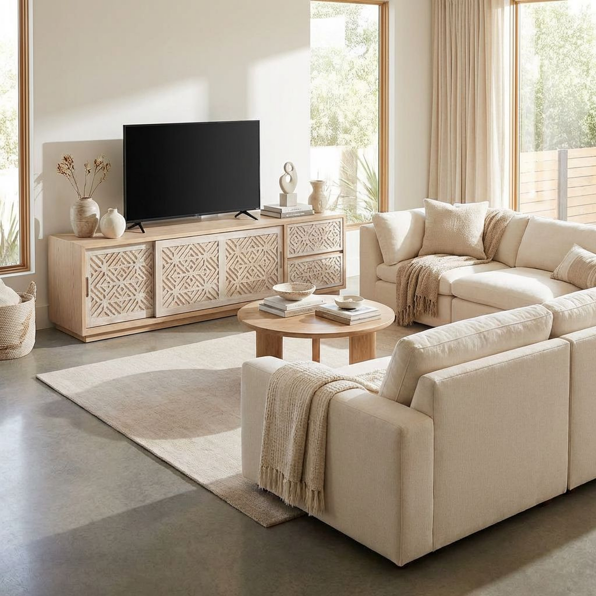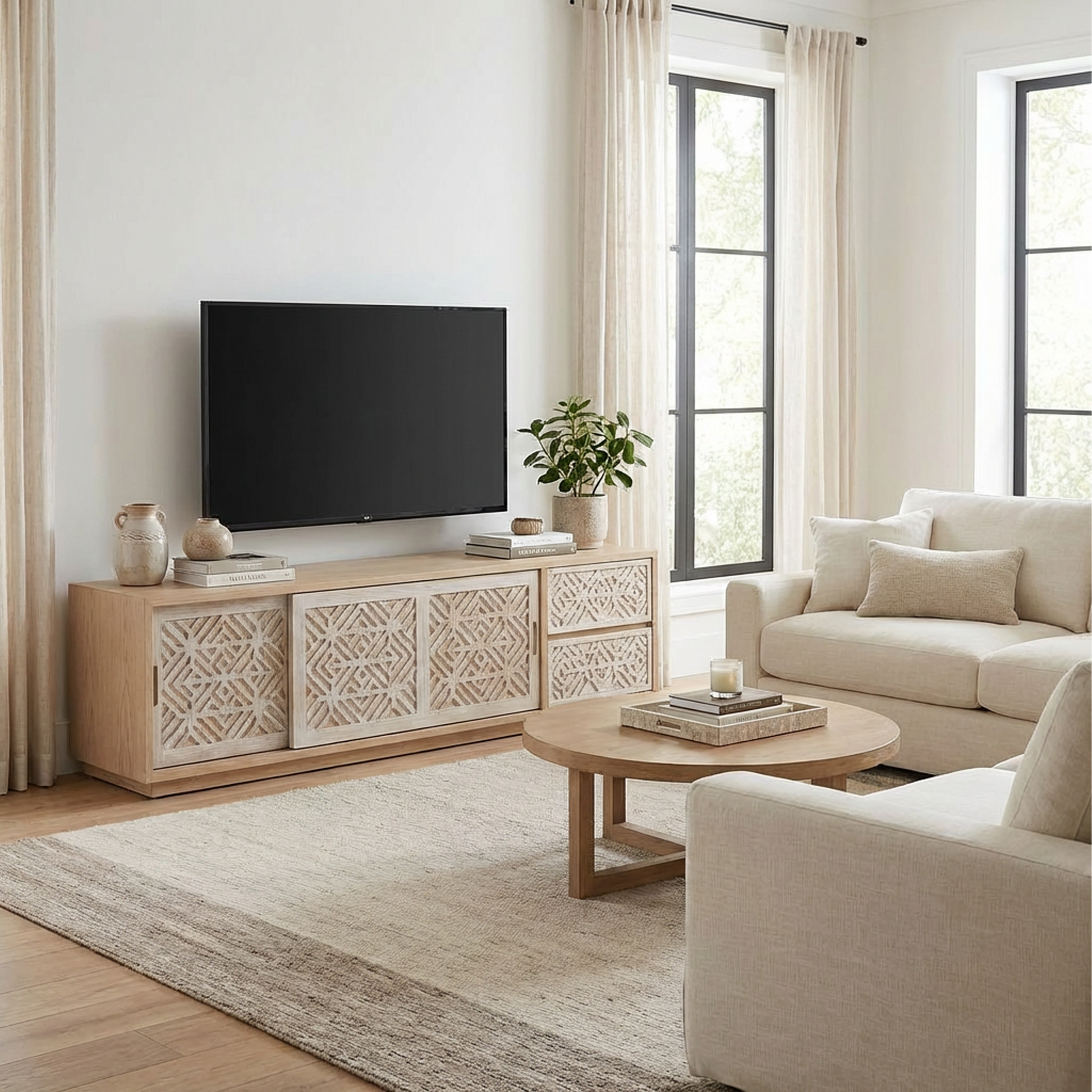 Add warmth and texture to your space with this long, low carved-wood console. The geometric, hand-carved style door fronts bring artisan character, while the clean silhouette and light natural finish keep it feeling modern and airy. Designed to work beautifully as a media console or a sideboard, it offers generous concealed storage to keep everyday essentials organized—without sacrificing style.