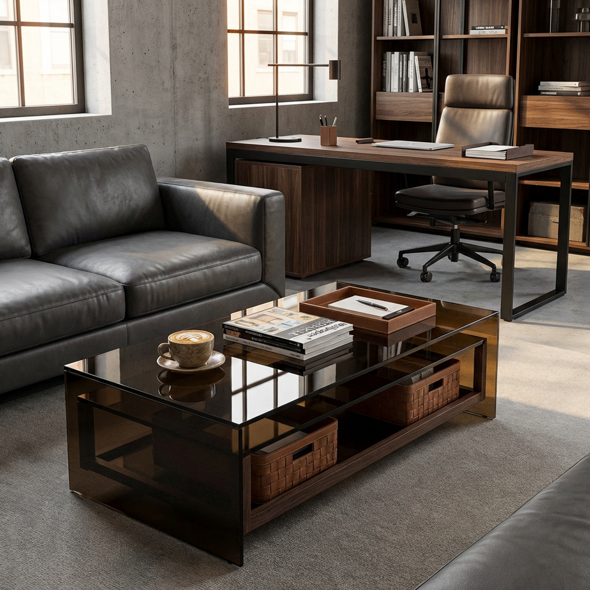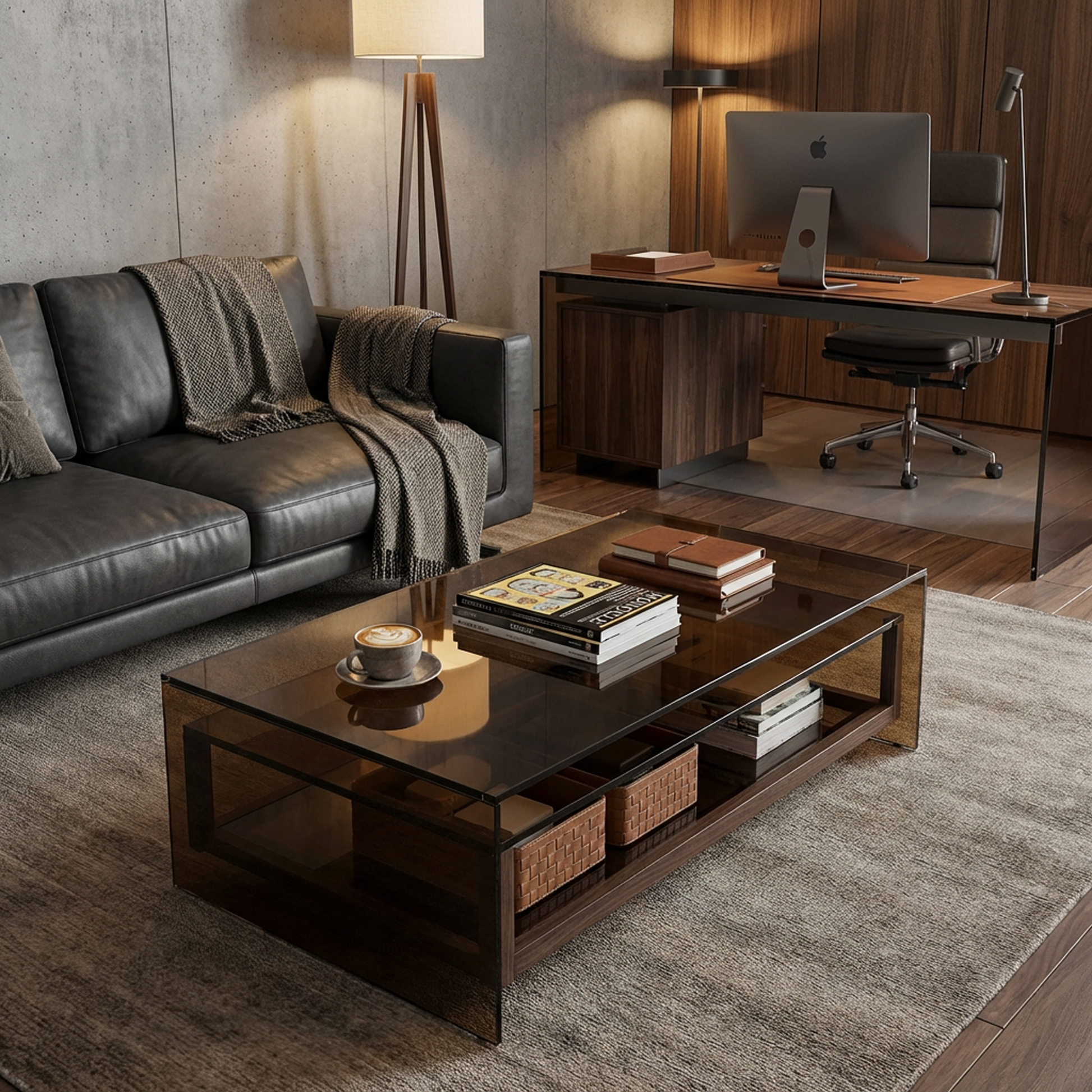 Make your living room feel instantly more elevated with this smoked-glass coffee table. The bronze-tinted glass creates a sleek, airy profile, while the integrated lower wood shelf adds warmth and practical storage for books, trays, and everyday essentials. With its low, modern silhouette and clean geometry, it works beautifully in contemporary, mid-century, and high-minimal interiors.